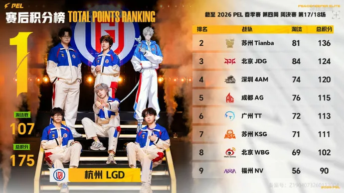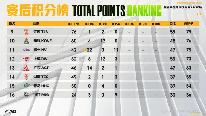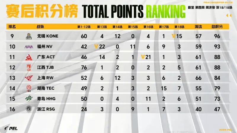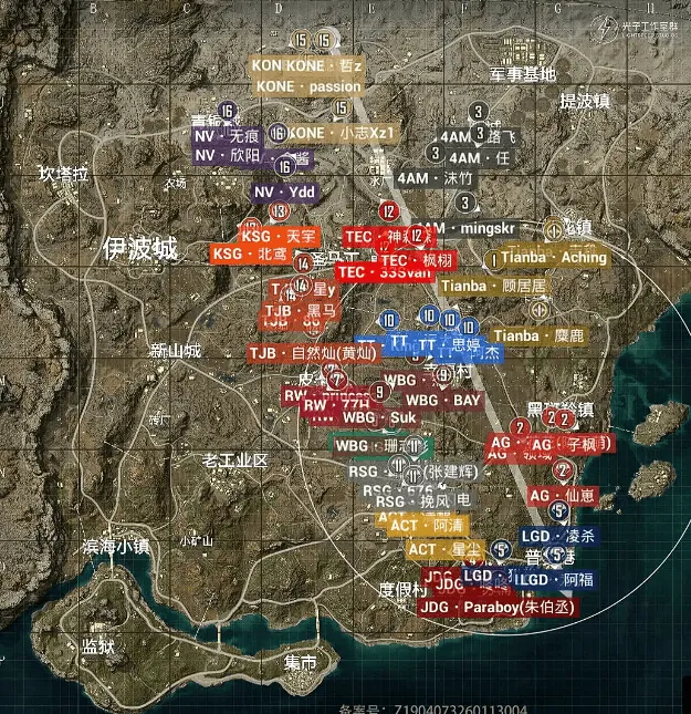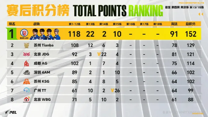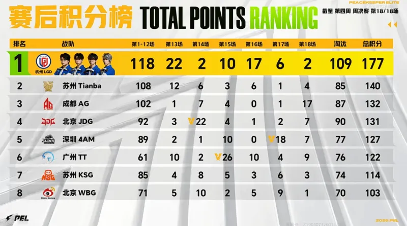 16分钟,WBG被Tianba一雷淘汰三个出局。19分钟,阶段刷新,KSG先被TEC打残,后被NV淘汰出局。随后,TEC将RW独狼淘汰,TJB也将TEC追击致死。21分钟,LGD淘汰,分数定格在177分。决胜时刻,AG/TT/4AM/KONE四队6个人,4AM先被淘汰,TT在被淘汰,最后子枫与passion皇城PK,最后KONE吃鸡。