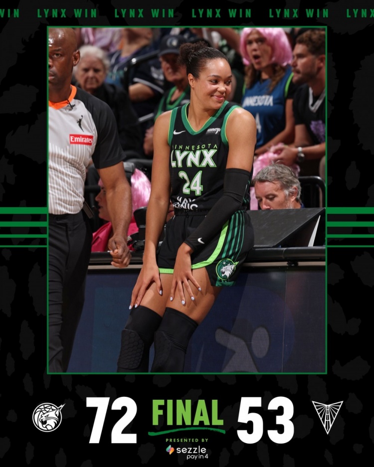 在收官战中,明尼苏达山猫以72比53战胜金州女武神,最终以34胜10负的优异战绩高居联盟榜首。